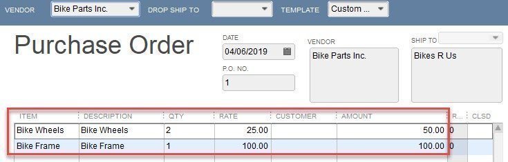 When selling the finished bike, we enter the assembled product as the item on a customer invoice. The individual components became part of this finished product when we did a build and do not need to be individually listed on the invoice when we sell the finished product. In our example, we are selling 2 wheels and 1 frame that is already part of the finished product.